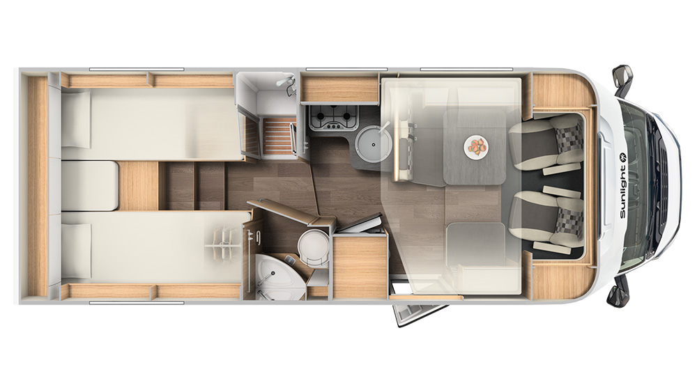 Inoltre, Sunlight T 68 è dotato di Isofix per due posti, aumentando la sicurezza per i più piccoli. Con una carreggiata allargata e dettagli come lo specchio con illuminazione indiretta e ganci appendiabiti, questo camper è progettato per offrire un'esperienza di viaggio superiore in ogni dettaglio.