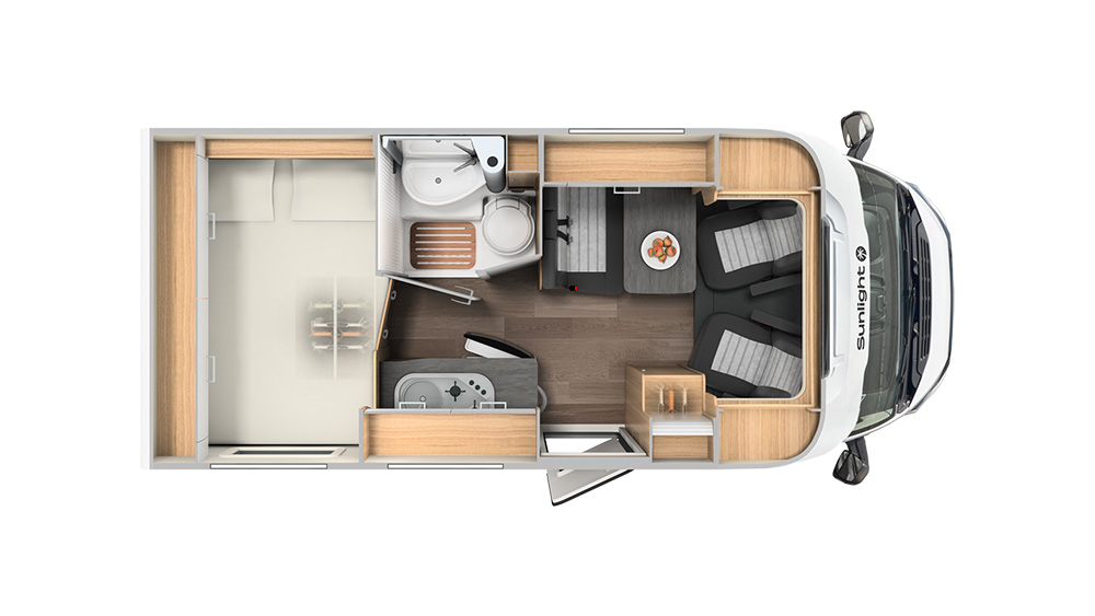 Nonostante le dimensioni esterne ridotte, l'interno del Sunlight V60 Adventure Edition offre un ampio spazio nella zona giorno, perfetto per rilassarsi e godersi il viaggio in tutta comodità. Inoltre, grazie allo spazio di stivaggio separato con garage posteriore, è possibile organizzare e riporre l'attrezzatura in modo ordinato e accessibile, permettendo di mantenere l'abitacolo libero da ingombri.