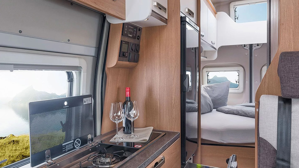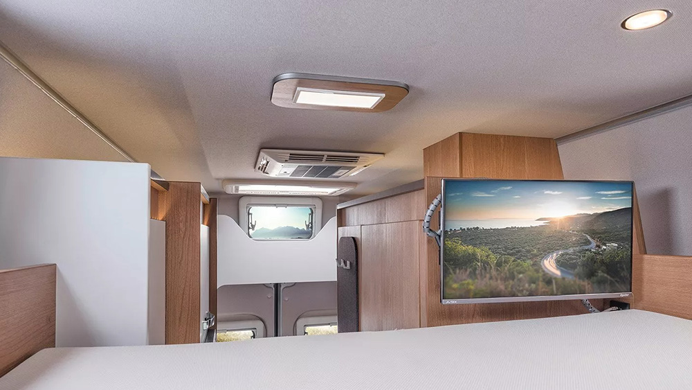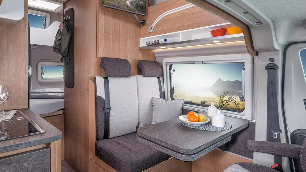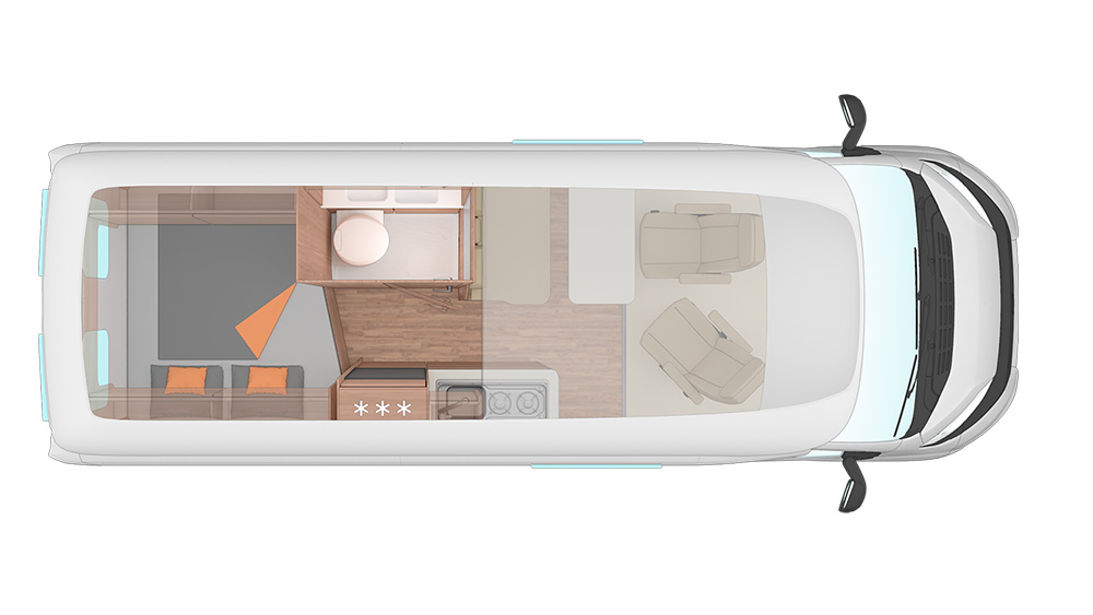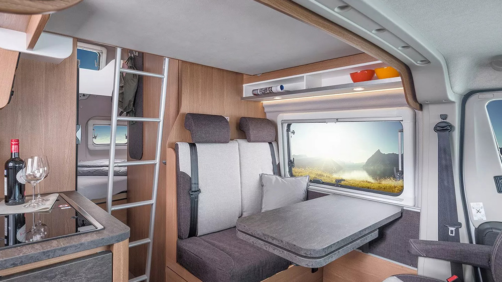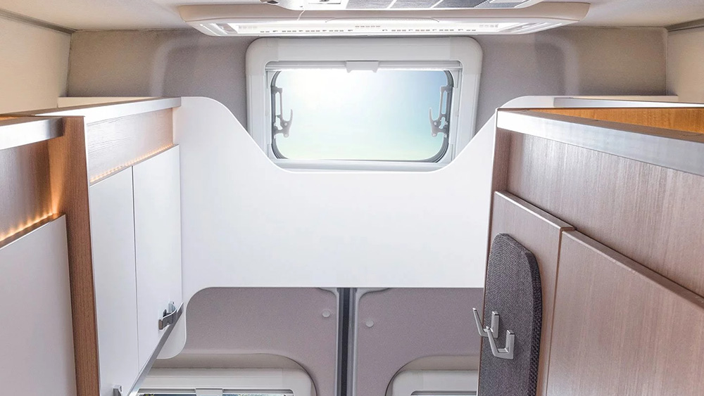 Il camper dispone di 5 posti letto, con un letto matrimoniale trasversale e un letto basculante per ottimizzare lo spazio. I sedili "Captainchair" FIAT, regolabili in altezza e con braccioli, offrono un comfort elevato durante la guida, supportati da una cabina con aria condizionata manuale e filtro antipolline. La sicurezza è garantita da sistemi avanzati come ESP, Hill Holder, ABS, assistenza in presenza di vento laterale e sistema di frenata post collisione.