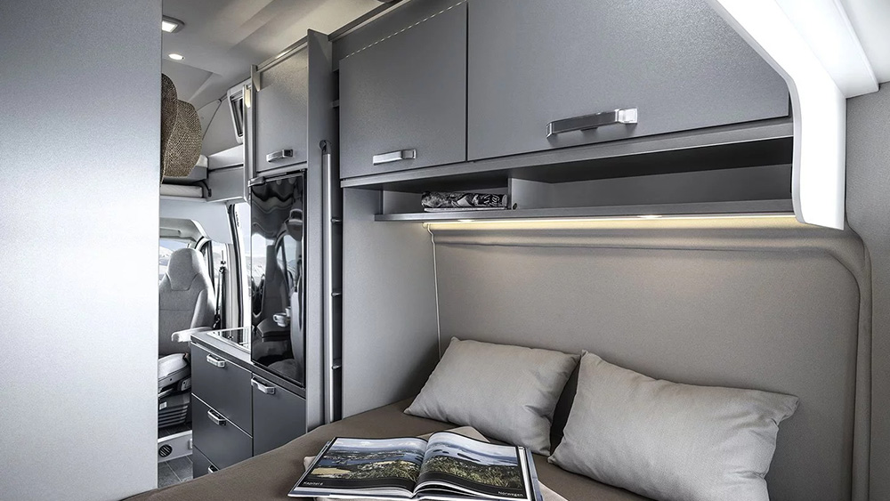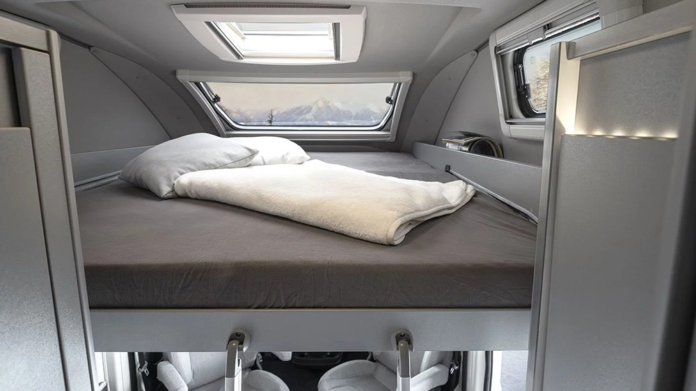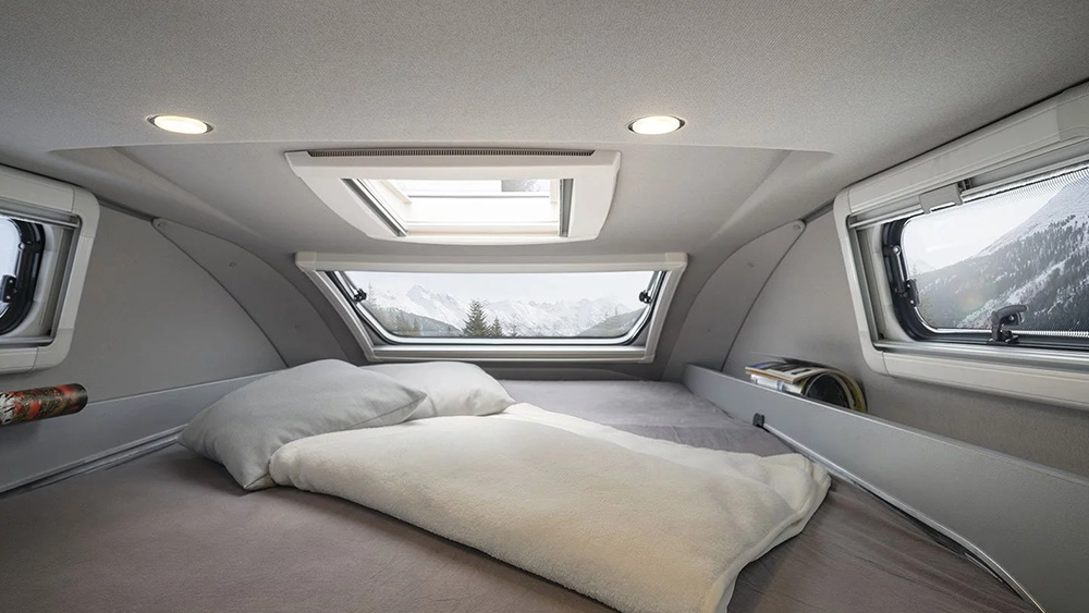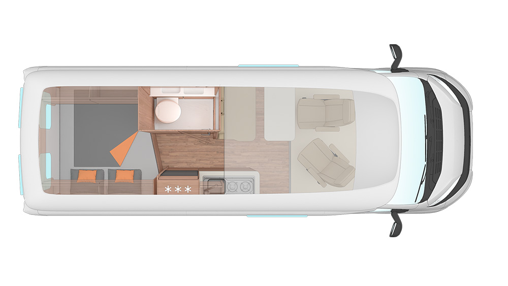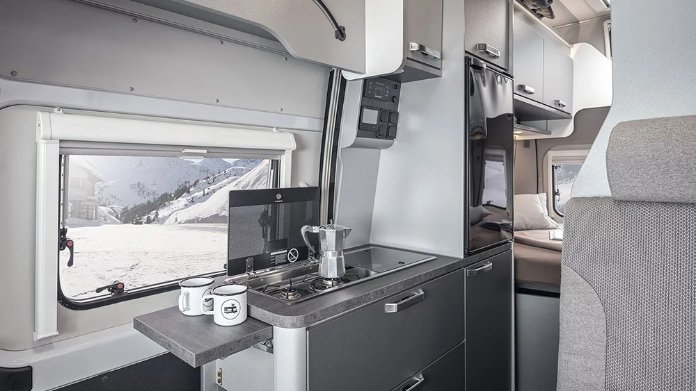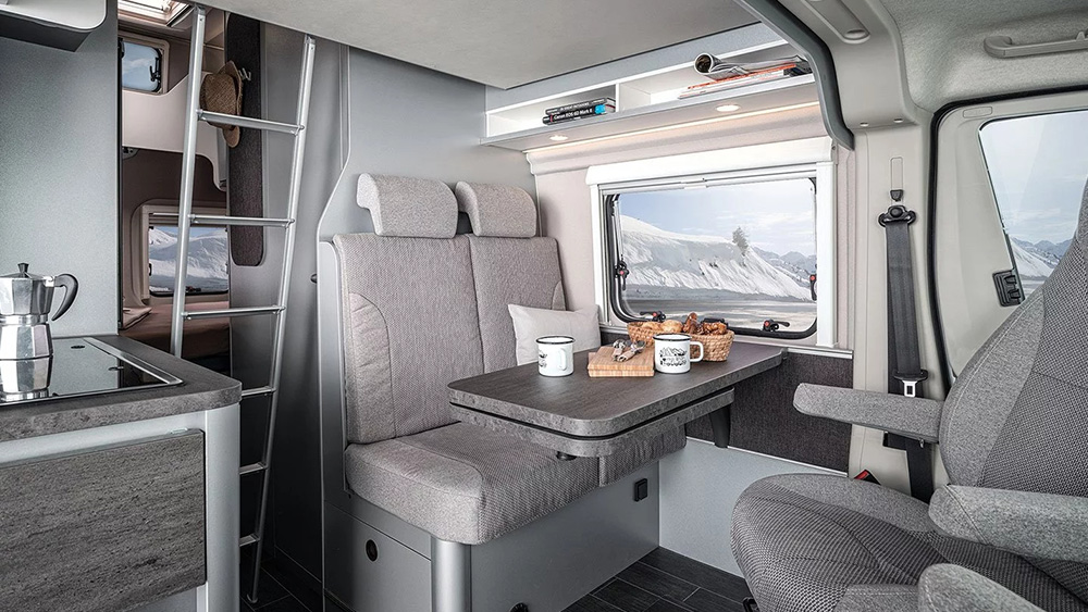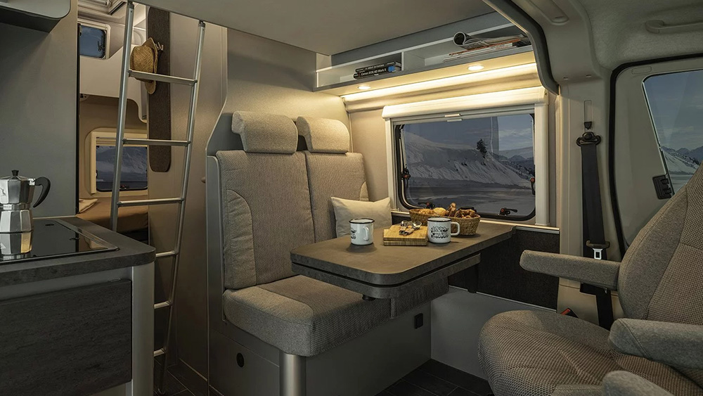 All'interno, l'abitacolo accogliente include sedili "Captainchair" FIAT con braccioli, rivestimenti di alta qualità e un sistema di oscuranti plissettati per privacy e comfort. La cucina è equipaggiata con un fornello a due fuochi, frigorifero a compressore da 95 litri e un ampio piano di lavoro, mentre il bagno ergonomico offre una doccia integrata e dettagli curati come il piatto doccia con percezione tattile "duna di sabbia".