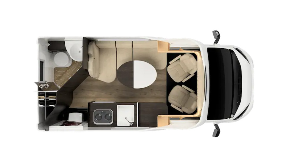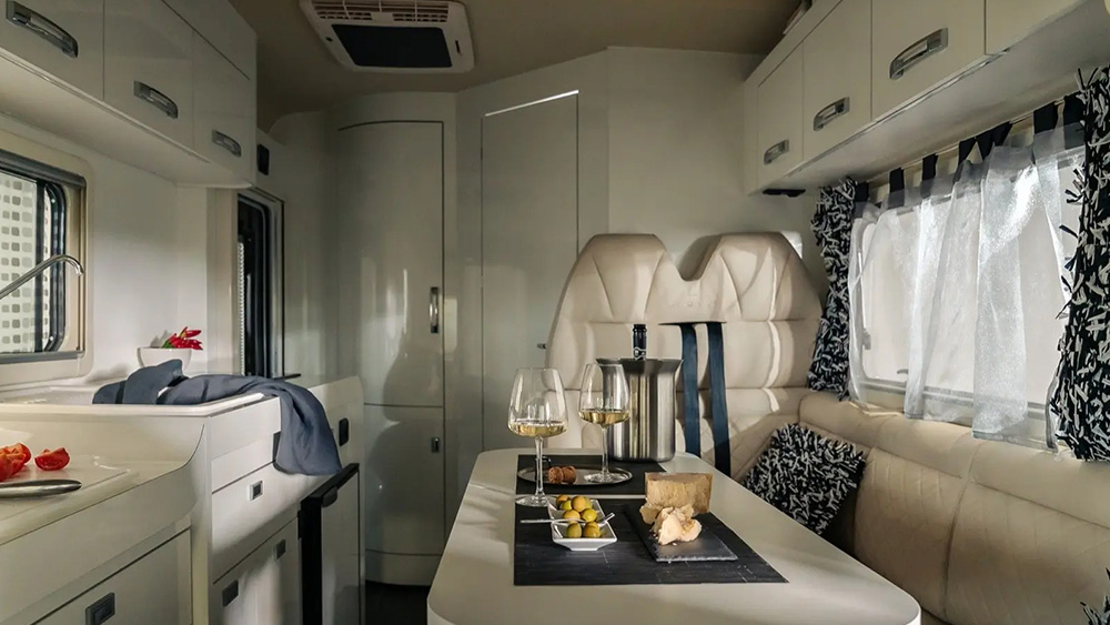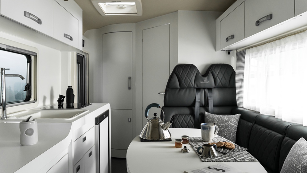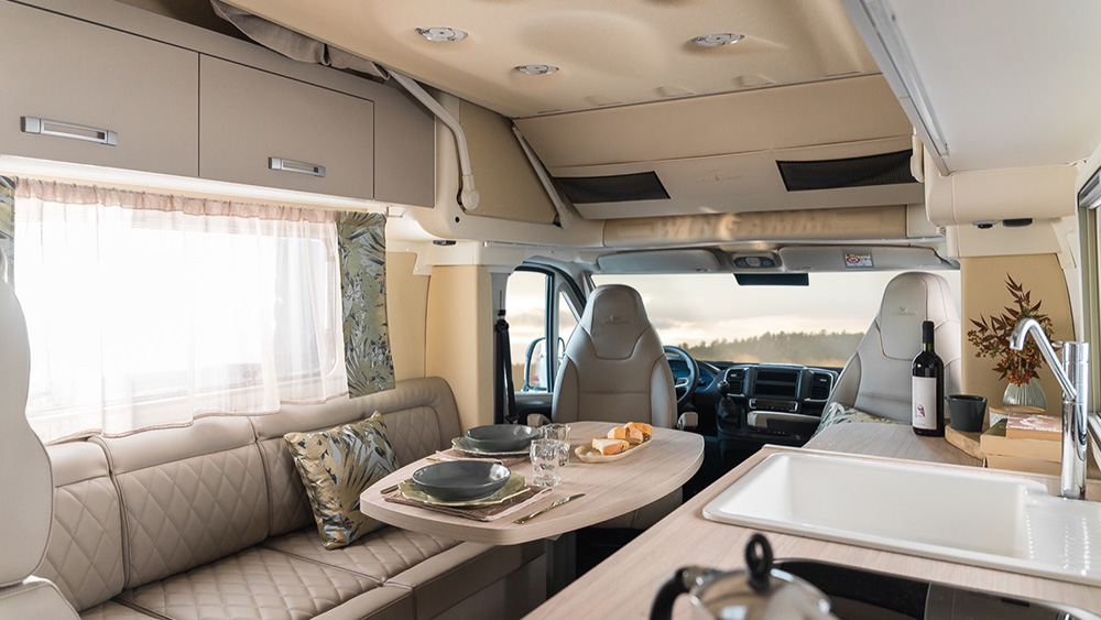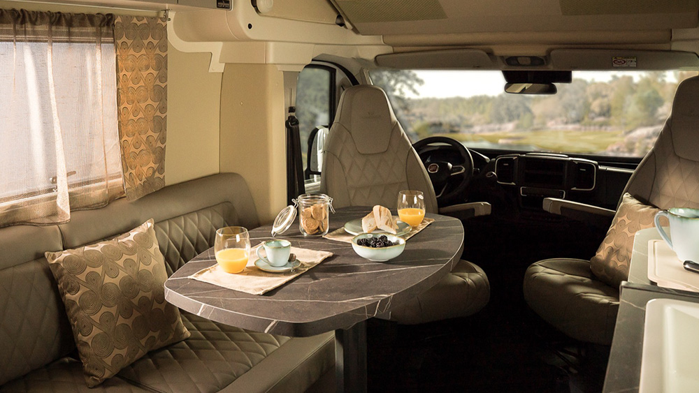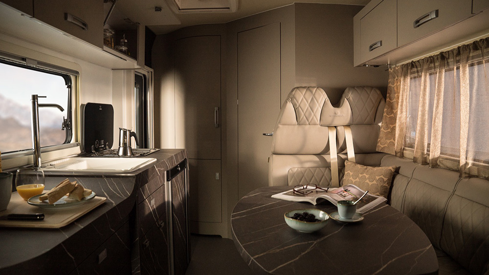 Le dimensioni esterne contenute si traducono in spazi interni sorprendentemente generosi. La disposizione arretrata della porta consente di sfruttare appieno ogni centimetro disponibile, regalando una cucina ampia e una toilette spaziosa, nonostante le dimensioni ridotte del veicolo. Il soggiorno, impreziosito da finiture di lusso, offre un'esperienza di vivibilità eccezionale, anche quando si hanno ospiti a bordo.