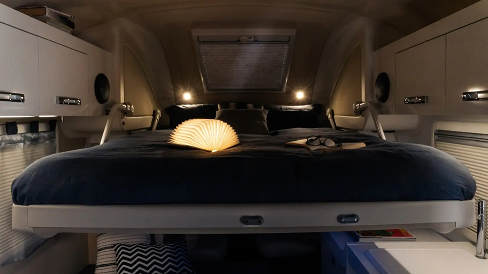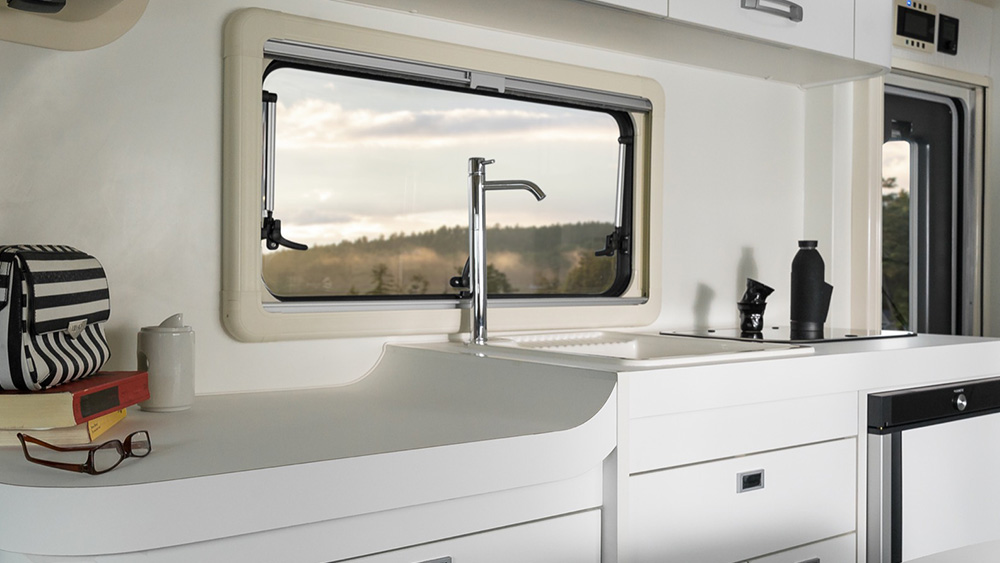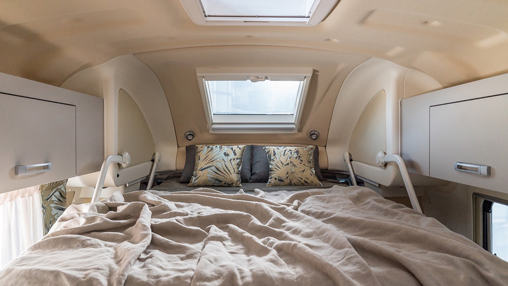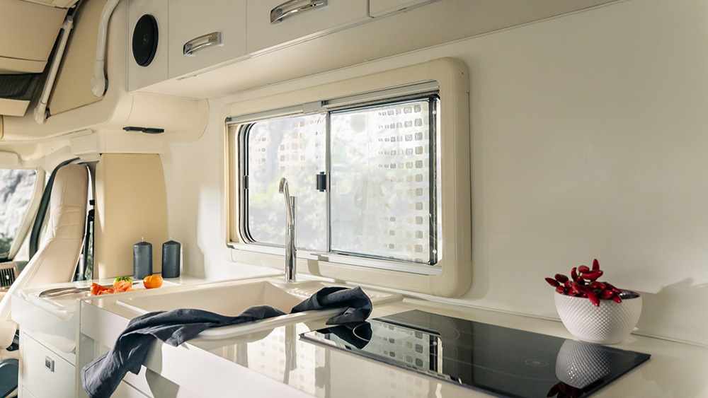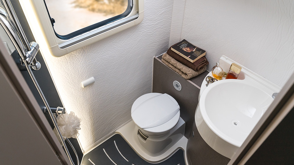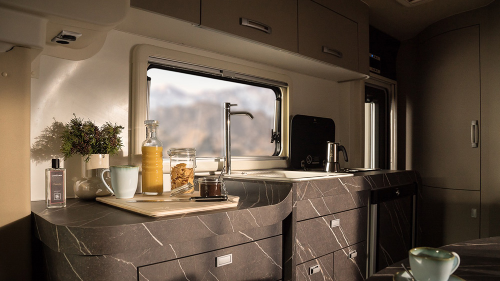 Le dimensioni esterne contenute si traducono in spazi interni sorprendentemente generosi. La disposizione arretrata della porta consente di sfruttare appieno ogni centimetro disponibile, regalando una cucina ampia e una toilette spaziosa, nonostante le dimensioni ridotte del veicolo. Il soggiorno, impreziosito da finiture di lusso, offre un'esperienza di vivibilità eccezionale, anche quando si hanno ospiti a bordo.