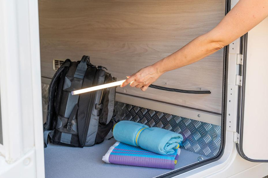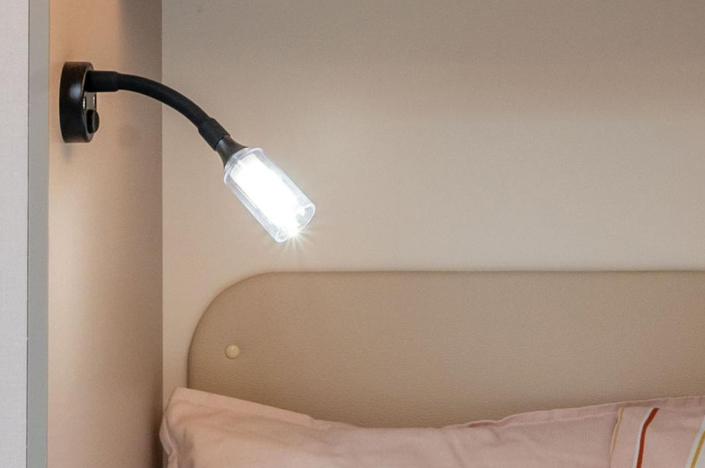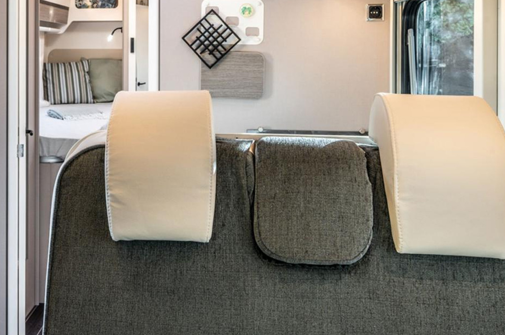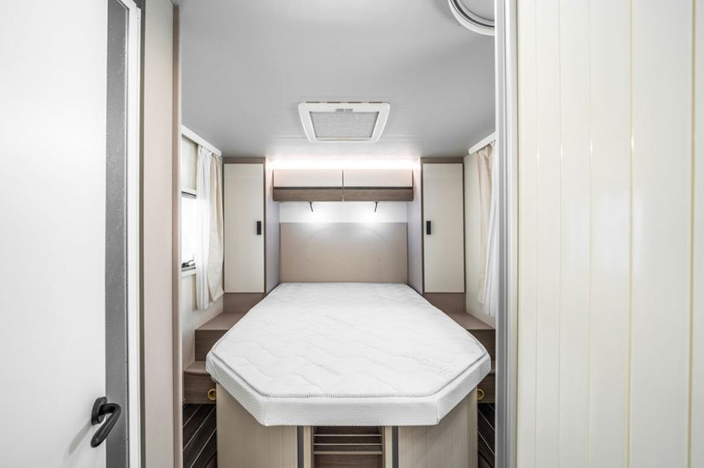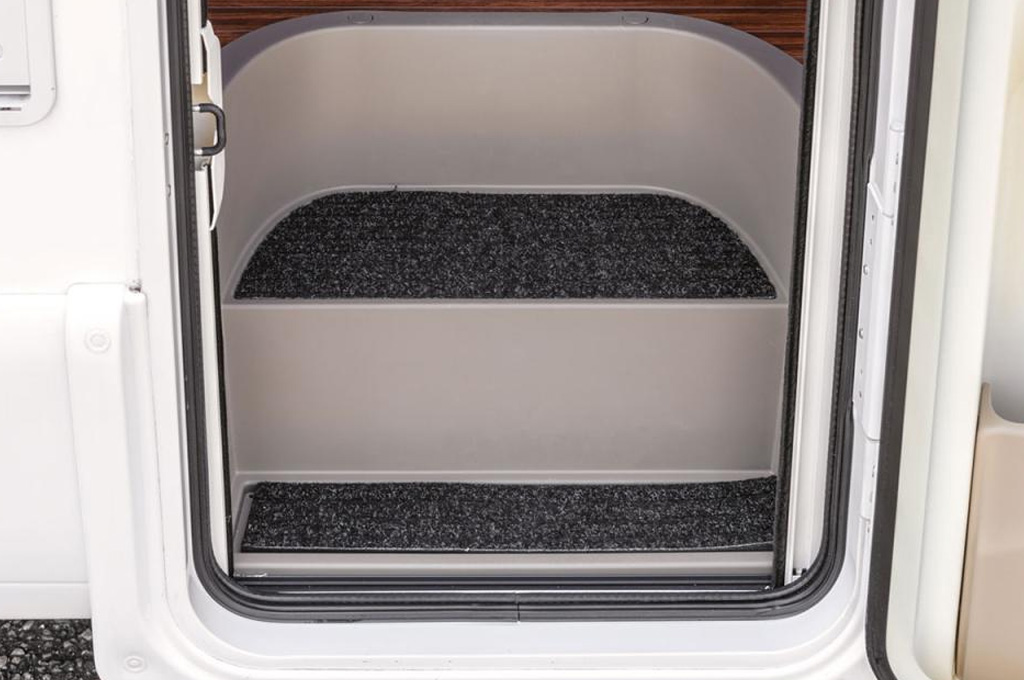 I letti posteriori con doghe in legno offrono un riposo confortevole, mentre la porta doccia rigida (presente su alcuni modelli) e la porta d'ingresso rinforzata con zanzariera aumentano la sicurezza e la praticità. Il pratico scalino ingresso rinforzato con zerbino integrato e la lampada tubolare removibile nel garage completano le caratteristiche di questa serie pensata per chi ama viaggiare senza rinunciare al comfort di casa.